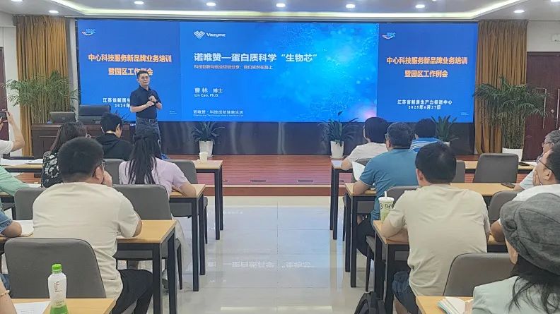 本次培训会还邀请南京诺唯赞生物科技有限公司董事长曹林博士围绕创新创业进行了经验分享和交流,曹博士结合自身科技创新与创业的实践,介绍了公司在关键核心技术上实现从0到1的突破,从初创科技企业一步步成长为上市企业历程,分享了瞄准应用场景,解决客户痛点,进行技术创新的实战经验。在诺唯赞的成长过程中,中心的科技创新服务对企业快速成长也起到了添砖加瓦的作用。曹博士表示,在未来新赛道培育服务上,希望能和中心进一步拓展合作的广度和深度。