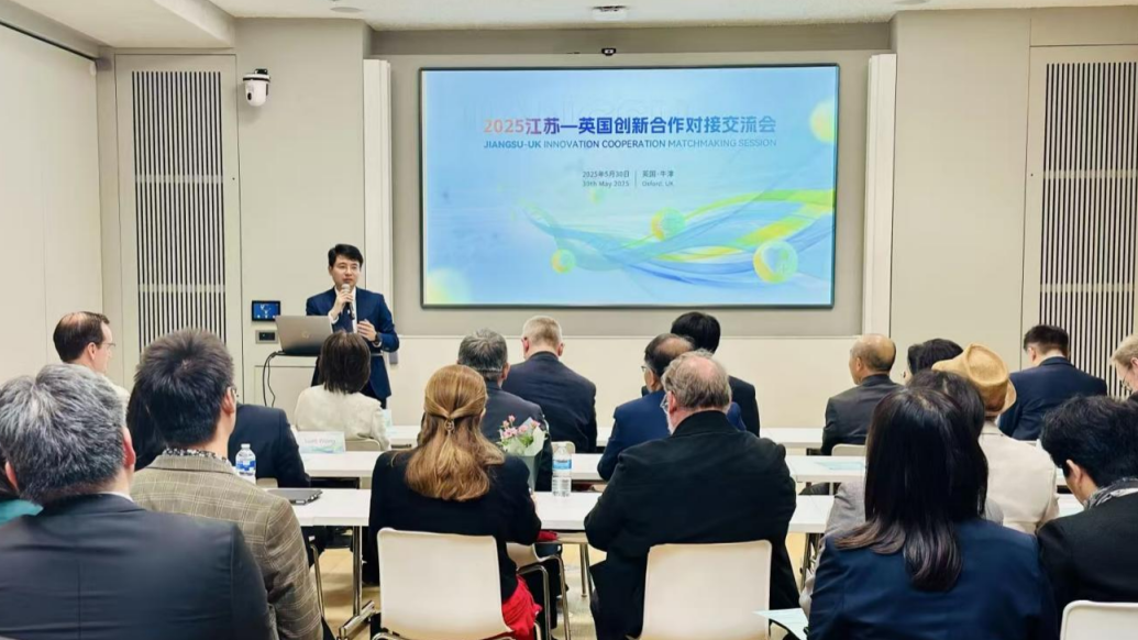 5月30日上午,“2025江苏—英国创新合作对接交流会”在牛津大学举行,赵岩副省长、牛津大学数理学部主任詹姆斯·亨德森·奈史密斯、中国驻英国大使馆科技处公参丁明勤出席会议并致辞,省产业技术研究院院长刘庆、牛津大学科技创新(苏州)中心总经理陈兆轩分别做推介。来自江苏、英国的高校、科研机构、科技企业等机构代表约50人参会。15位英国机构和江苏企业代表分别进行了技术项目与合作需求发布,开展了一对一对接洽谈。
