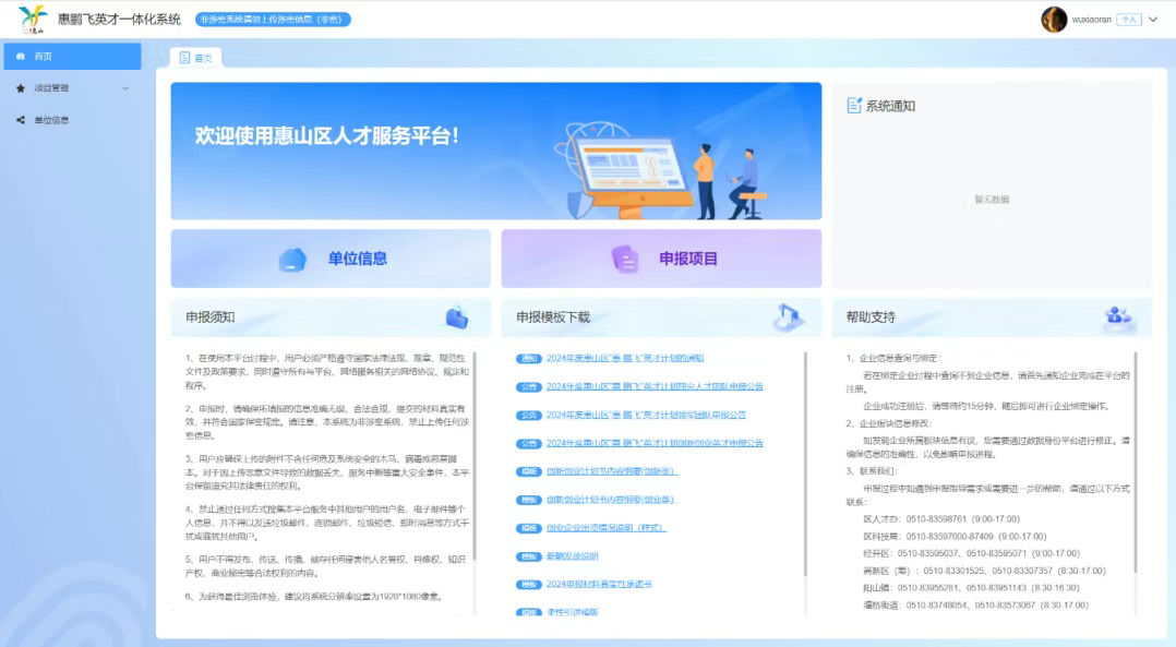 大数据中心2024年4月受惠山区委组织部委托组织开发建设“惠・鹏飞”英才一体化系统,实现两大核心功能:一是实现项目从申报到立项再到验收全流程全留痕,增强项目管理的规范性和透明度;二是人才分类认定和人才数据库建设,精准对接人才服务需求,成为惠山区人才管理和服务工作的重要支撑平台。系统于2024年9月上线试运行,成功支撑惠山区2024年度多项科技人才项目的线上申报评审及立项管理工作,并在2025年举办的“惠・鹏飞”人才创新发展大会上由省生产力促进中心副主任张维祥与惠山区委常委、组织部部长吴波共同启动上线发布。