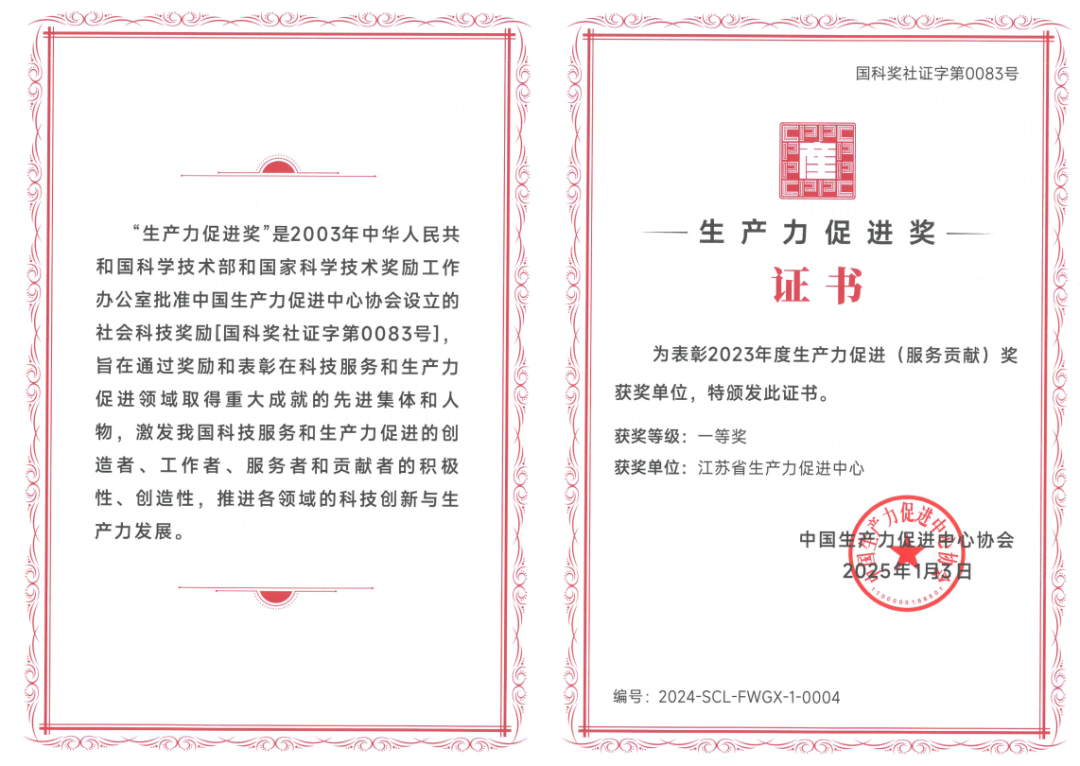 近日,2024中国生产力促进奖颁奖典礼在北京召开,江苏省生产力促进中心获授2023年度“生产力促进(服务贡献)一等奖”,为江苏省唯一,在全国2000多家同类科技服务机构中位于前列。