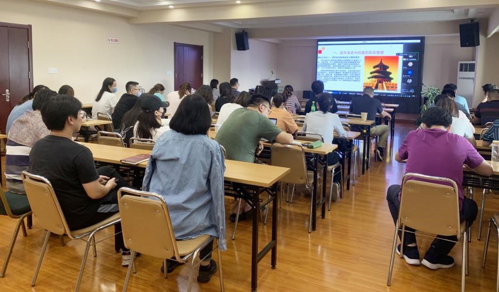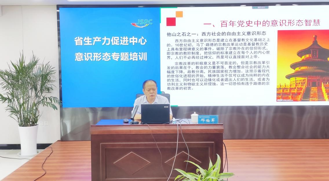 9月27日下午,省生产力促进中心举办了意识形态专题培训,邀请南京航空航天大学马克思主义学院教授邓伯军作了题为“汲取百年党史智慧 加强网络空间的意识形态安全”的讲座。党政领导班子成员、全体党员、民主党派人士、共青团干部和海归青年理论学习小组等150多人通过“线上+线下”方式参加了培训。