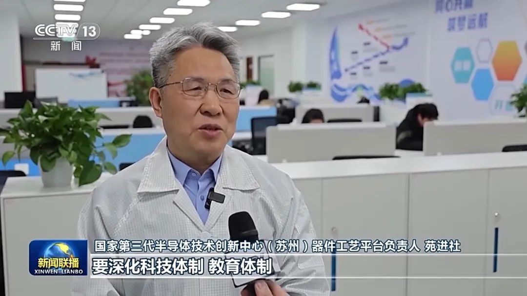 国家第三代半导体技术创新中心(苏州)器件工艺平台负责人 苑进社:习近平总书记强调,要深化科技体制、教育体制、人才体制等改革,打通束缚新质生产力发展的堵点卡点,我们打破了以往单打独斗的模式,通过打造开放共享的实验室,联合上下游共同检验验证,遇到问题共同探讨,协同创新。