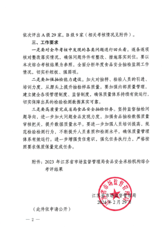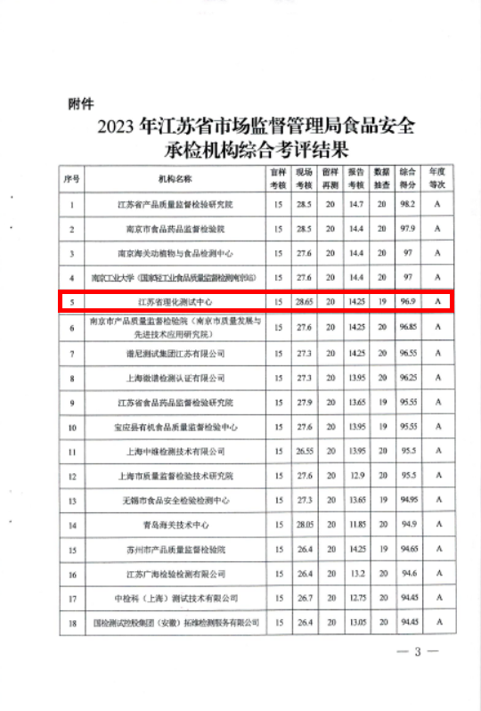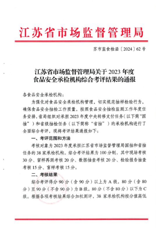 近日,江苏省市场监督管理局通报了2023年度食品安全承检机构综合考评结果,江苏省理化测试中心获评“A级”等次,在承担2023年度中央转移支付任务和省级抽检任务的38家承检机构中排名第五。