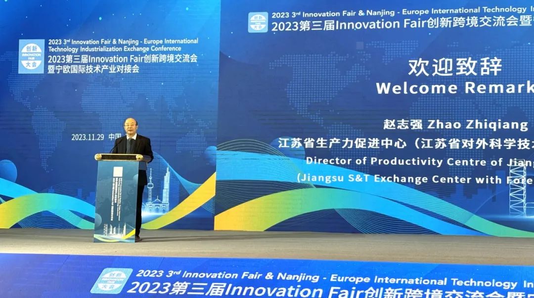 2023年11月29日第三届“Innovation Fair”创新跨境交流会在南京成功举办。江苏省对外科学技术交流中心、江苏—德国协同创新服务中心联合德国斯图加特展览集团共同举办了本届大会。来自德国、意大利、爱尔兰等欧洲国家代表和江苏机构代表近200人现场参会。中心主任赵志强出席大会开幕式并致辞。