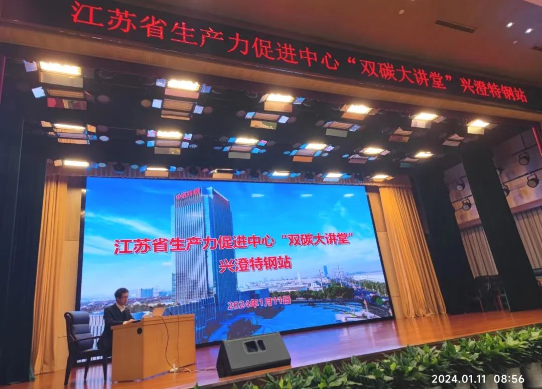 为进一步提高我省重点钢铁企业的低碳技术能力,增强碳排放管理有效手段,积极应对国际绿色贸易规则,江苏省生产力促进中心特邀国家冶金工业信息标准院低碳标准化工作组秘书长陈剑、DEKRA驻中国区体系认证与供应链可持续发展业务总经理韦斌生于1月11日举办了2024年第一期“双碳大讲堂”钢铁行业专题活动。会议由中国特钢企业协会冶金装备分会会长、兴澄特钢副总经理王永建主持,中信泰富特钢集团以及兴澄特钢和各研究所、分厂的低碳技术与管理部门代表等近百人参加活动。