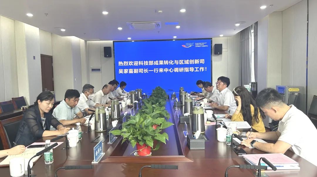 7月19日,科技部成果转化与区域创新司吴家喜副司长到江苏省生产力促进中心调研指导成果转化与创新服务工作。省科技厅副厅长蒋洪陪同调研。