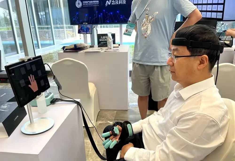 将脑机接口与外骨骼机器人有机结合,形成具有主动康复功能的脑控手康复训练系统(手套),使用者通过“意念”控制外骨骼机械手,带动瘫痪手部进行训练,可做出各种复杂动作,帮助使用者实现肢体康复训练。仅用一年左右时间,就完成这项高难度系统的研发,是怎么做到的?江苏省产业技术研究院脑机融合智能技术研究所副所长赖艳介绍,这要依赖于新型研发机构在投资主体多元化、运行机制市场化、研发方向前沿化等方面具备的独特优势。脑机所由江苏省产研院、苏州高铁新城和中国科学院半导体所脑机接口科研团队三方共建,是以企业方式灵活运营的新型研发机构,而苏州念及智能科技有限公司则是脑机所孵化的企业,以“脑机接口”产业技术开发和应用解决方案为研发重点,面向数字医疗、教育科技、人机交互、脑科学研究等多种应用场景,提供基于脑机接口技术的新一代人机交互智能产品和解决方案。